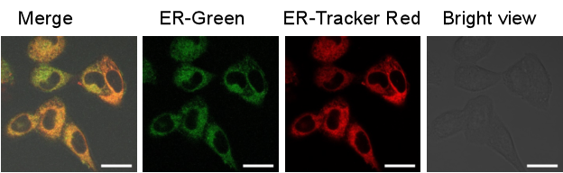ER-Green是生光生物科技公司通過對對文獻(xiàn)報(bào)道內(nèi)質(zhì)網(wǎng)探針進(jìn)行結(jié)構(gòu)修飾與優(yōu)化,篩選得到的一類高選擇性內(nèi)質(zhì)網(wǎng)定位綠色熒光探針。ER-Green可以用于活細(xì)胞內(nèi)質(zhì)網(wǎng)特異性熒光染色。與商業(yè)化 ER-Tracker Red 等探針相比,ER-Green熒光強(qiáng)度強(qiáng),細(xì)胞毒性低,光穩(wěn)定性強(qiáng)。ER-Green在活細(xì)胞內(nèi)持續(xù)時間長,可以和其它探針實(shí)現(xiàn)聯(lián)合使用。